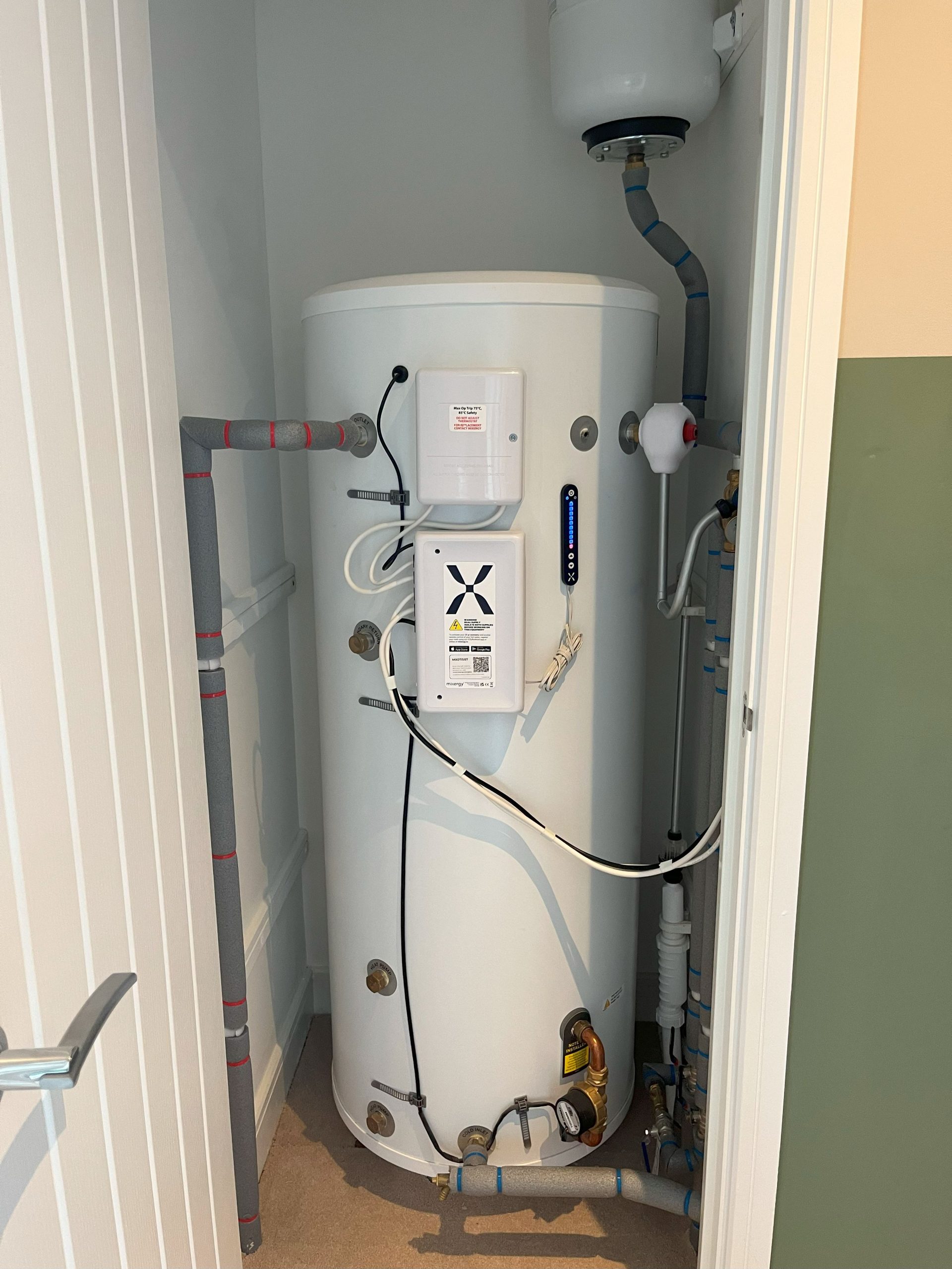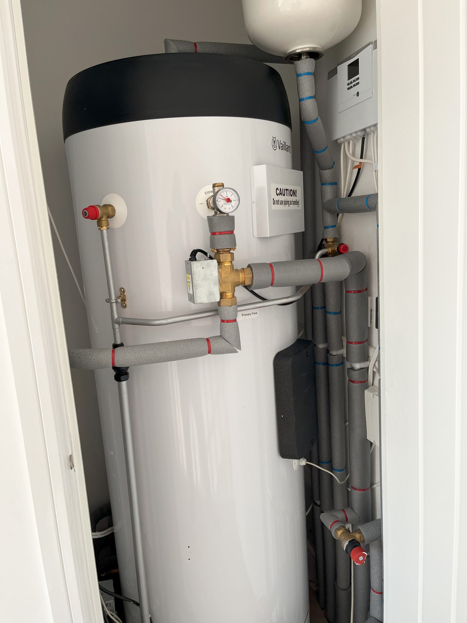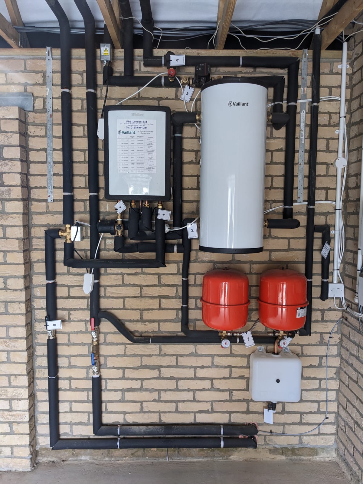 The developments properties run individual systems where the ASHP is using glycol sent to a plate heat exchanger which transfers accumulated heat across a plate to traditional inhibited waters running through the heating circuits and cylinder coil.