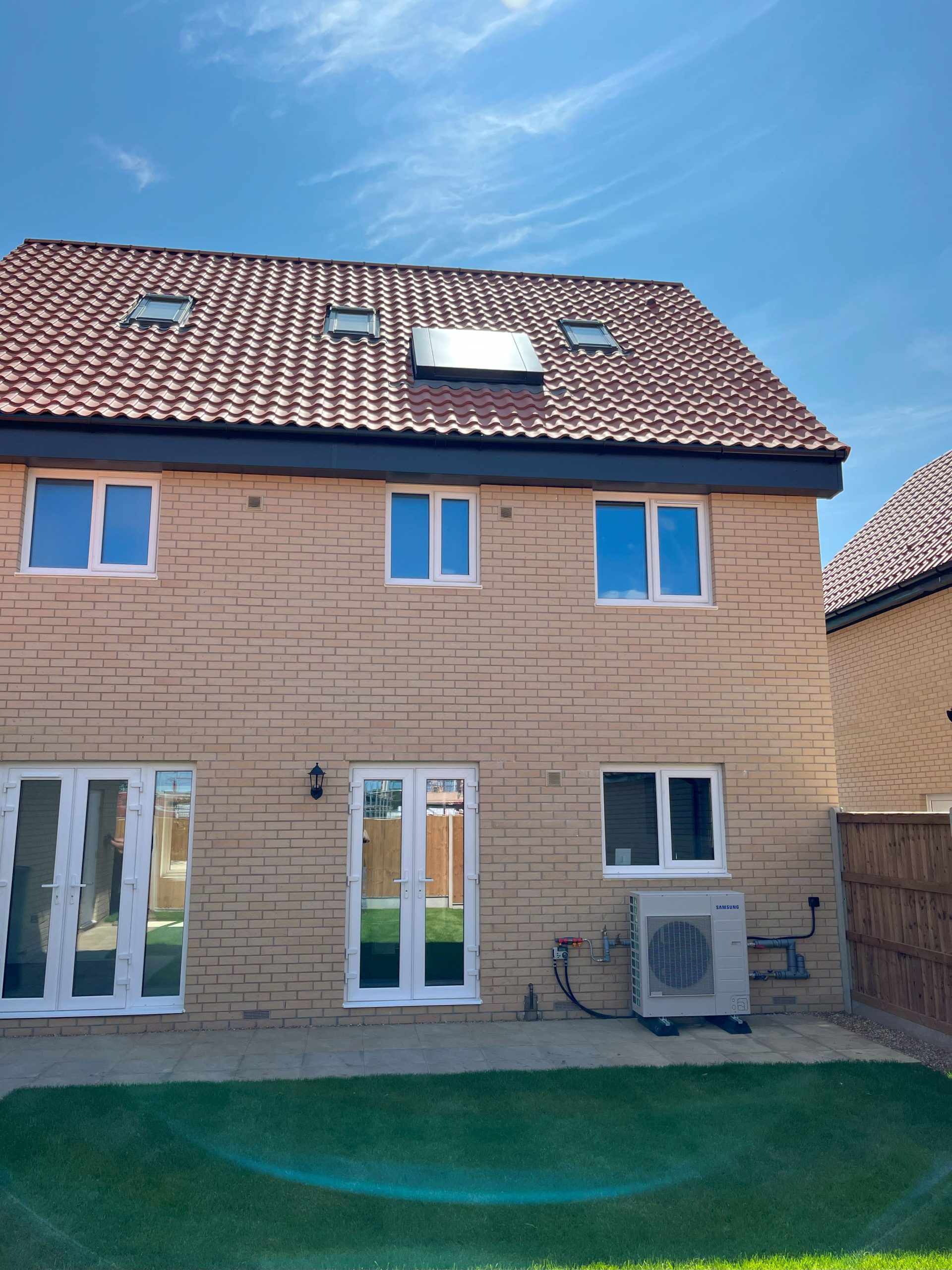 A different ASHP manufacturer again was chosen by this developer based around the same principle, fan unit externally, running full inhibited water system from the ASHP primaries pipes to a full wet radiator system with hot water cylinder.