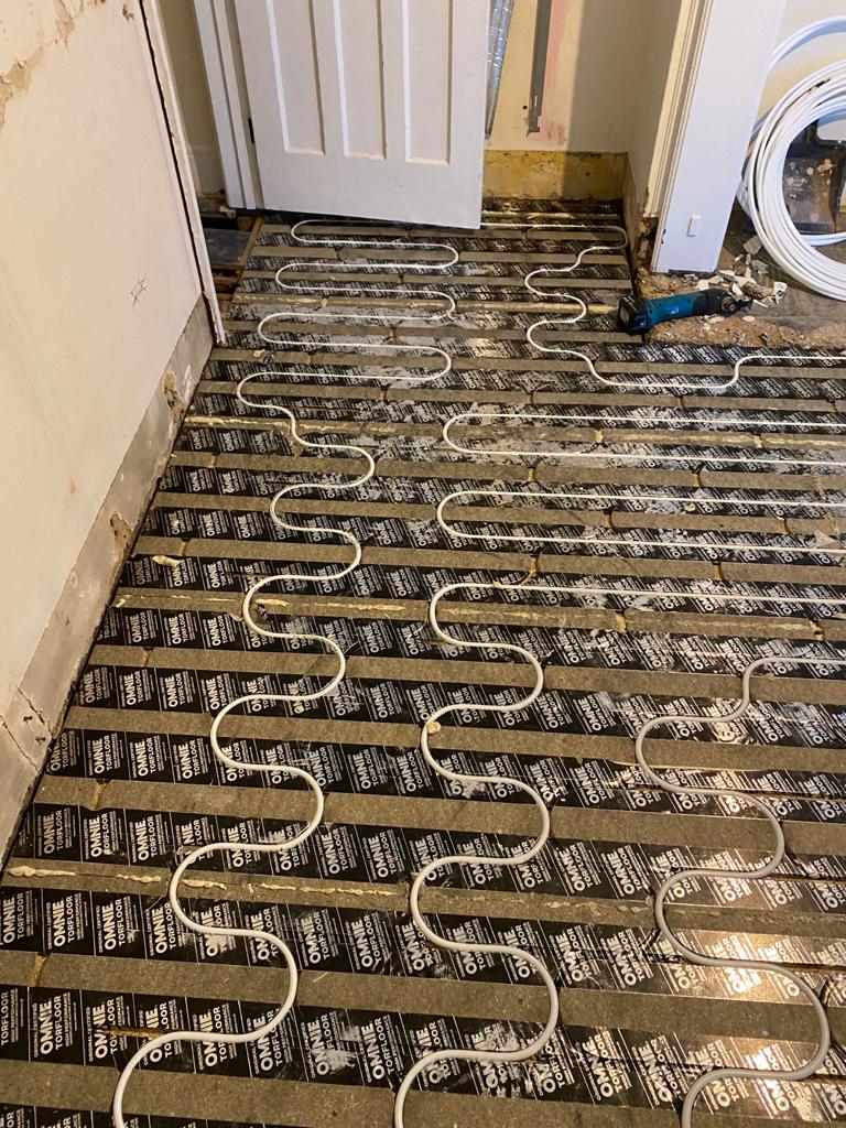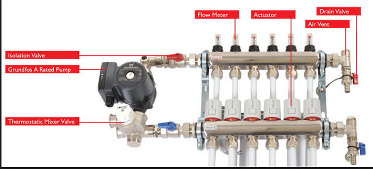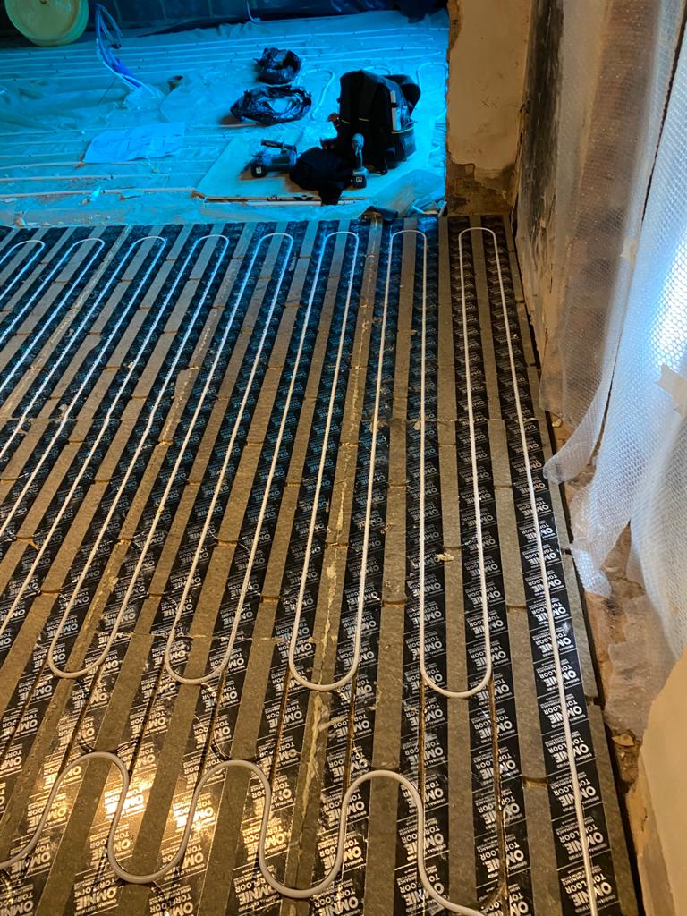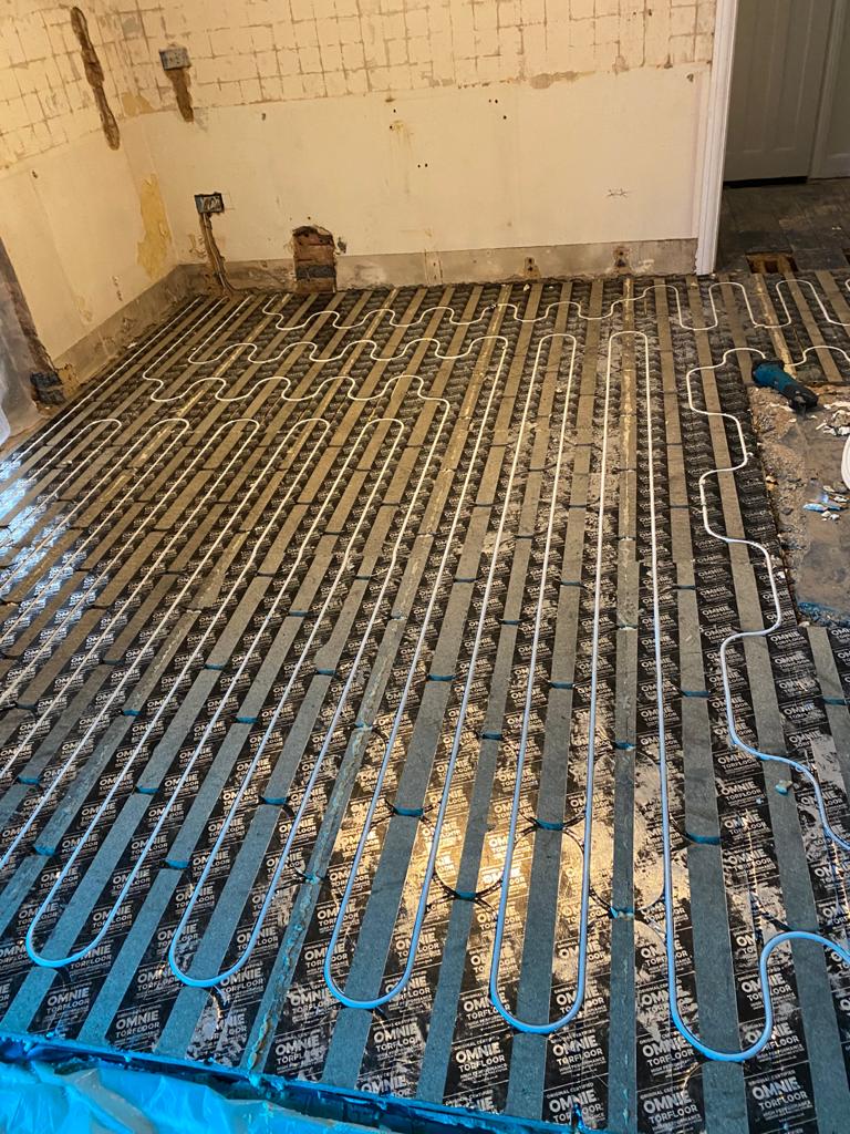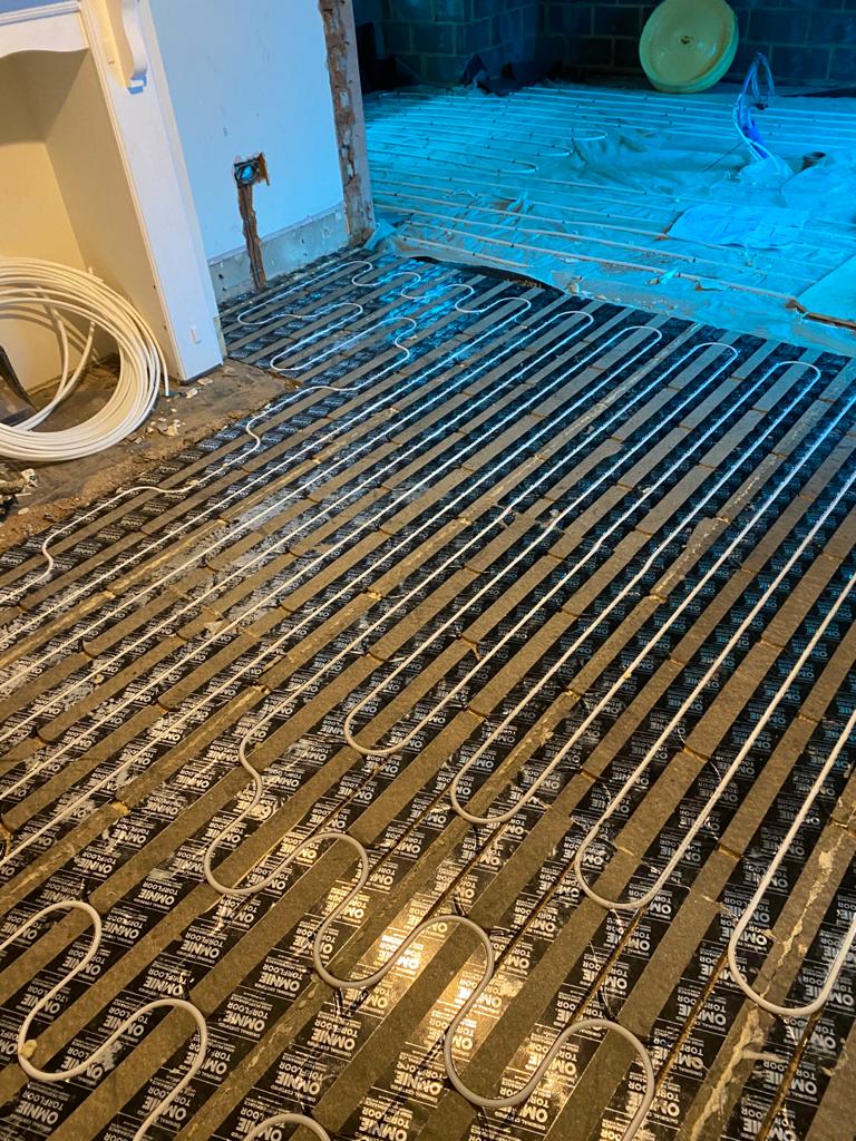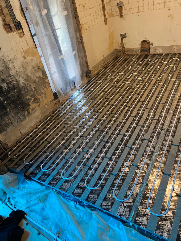 Underfloor heating system installed to ground floor areas running back to a manifold system with the heat source provided by a natural gas boiler. Commonly more of these underfloor circuits are being linked to air source heating. This is an effective way to heat an area subject to careful consideration of floor coverings. This means of heating needs careful explanation at the handover stage to the homeowner as the heating response is steadier and more progressive then the boost facility provided by the typical wet central heating provided by radiators.